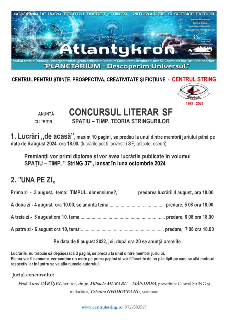 1. Lucrări ,,de acasă”, maxim 10 pagini, se predau la unul dintre membrii juriului până pe data de 6 august 2024, ora 18.00. (lucrările pot fi: povestiri SF, articole, eseuri)