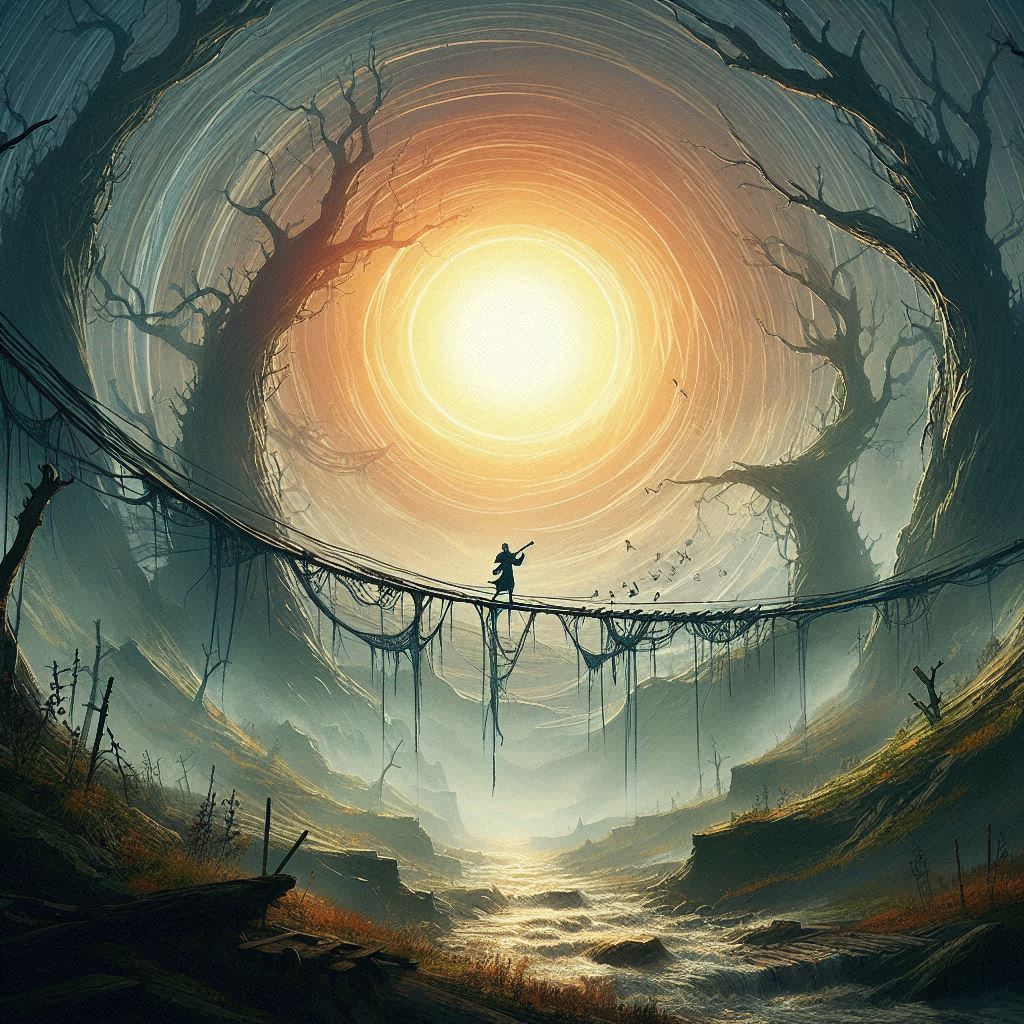 In their journey to the center of the song, they passed through layers and dimensions that they would not have suspected. The knots stretched and bent as they approached the place where the space seemed to dissolve itself. Finally, they reached a point where there was no clear definition of reality. Everything was a fluid mass of possibilities, and in the center of this chaos, the song was stronger than ever.