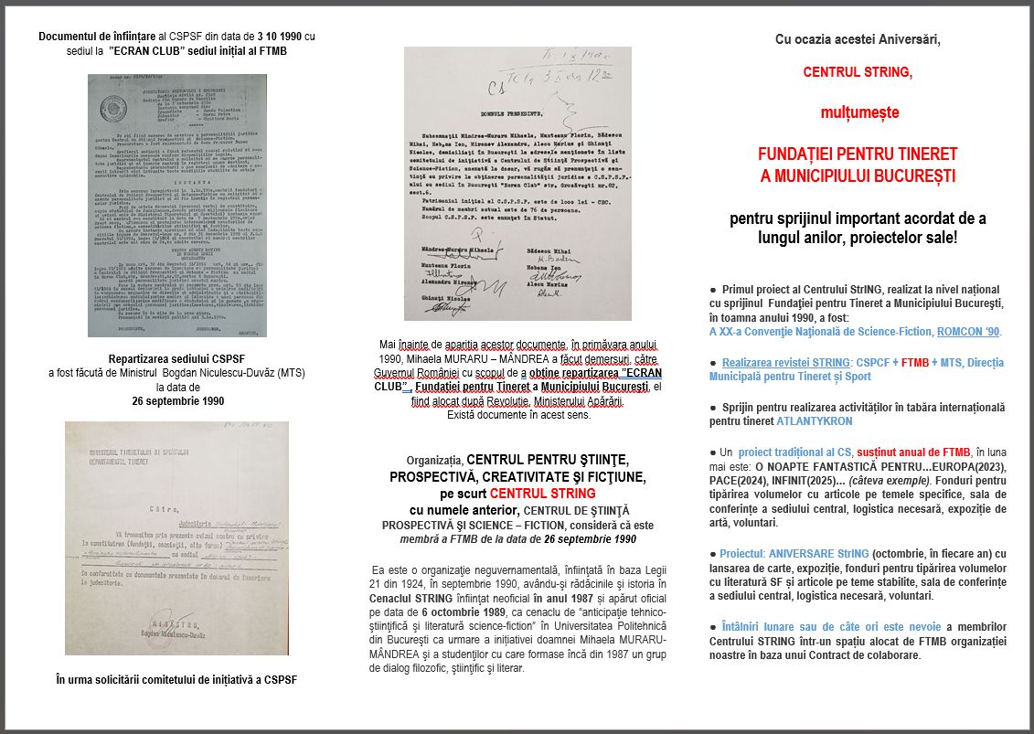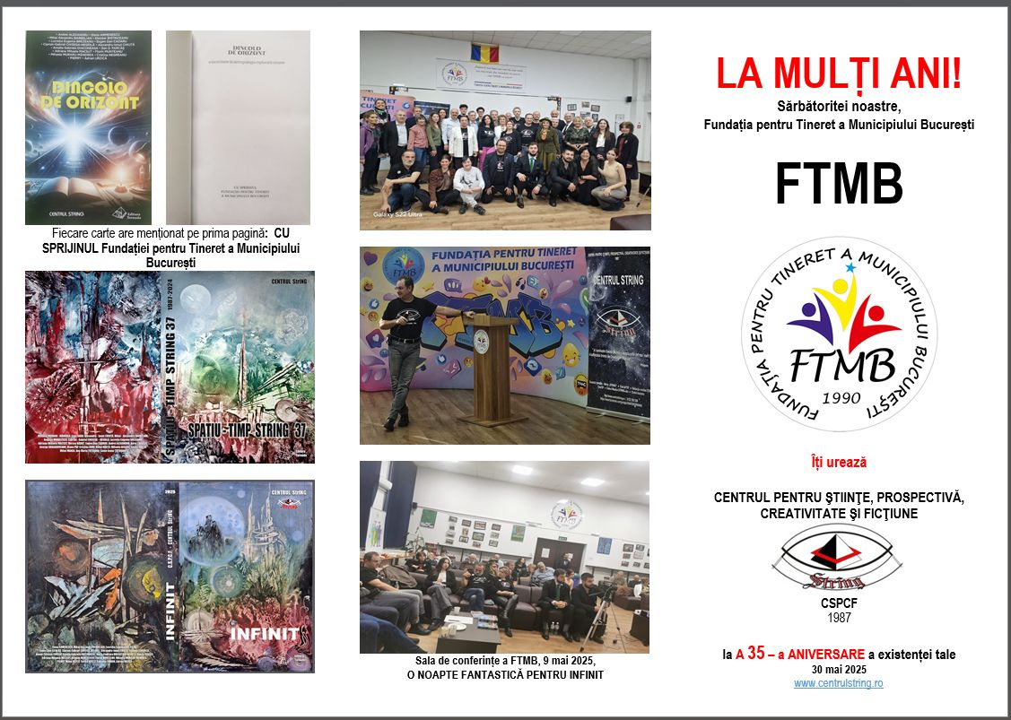 CENTRUL PENTRU ȘTIINȚE, PROSPECTIVĂ, CREATIVITATE ȘI FICȚIUNE dorește să transmită un mesaj cald și sincer de recunoștință către Fundația pentru Tineret a Municipiului București (FTMB) pentru sprijinul constant și valoros acordat de-a lungul anilor proiectelor noastre.