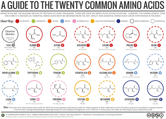 Sunt 20 de aminoacizi în genetica umană, fiecare cu propria lui formulă chimică, așa cum se descrie în Fig.5 și în Tab.1 din continuare. Ce au în comun toți acești aminoacizi: grupări bazice amino -NH2 și grupări acide carboxil -COOH (unde R reprezintă un anumit radical nespecificat aici).