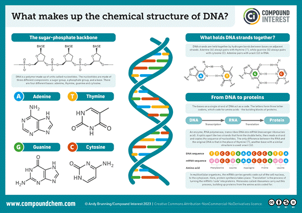 Se observă că pe scheletul format din molecule de zahar (deoxiriboza, pentru complezență … un zahar similar cu riboza din ARN … dar care a pierdut o grupare hidroxil -OH) și fosfat-, Fig.3-4 (derivat din ATP – adenozin trifosfatul despre care vorbeam mai devreme când se prezenta pe scurt mitocondria: poziția (9) din Fig.1) se află bazele nucleare, cele 4 litere ale alfabetului genetic: A – adenină, C – citozină, G – guanină și T – Timină (Fig.4). Aceste caractere din alfabetul genetic se combină câte două pentru a lega cele două catene ale moleculei de ADN. Adenina (A) cu Timina (T), prin 2 legături de hidrogen, A === T și Citozina (C) cu Guanina, prin 3 legături de hidrogen, C ≡≡≡ G (Fig.3-4).