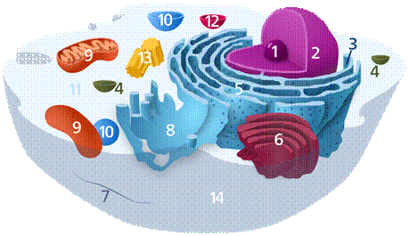 Fig.1 – Structura unei celule eucariote: 1 – nucleol, 2 – nucleu, 3 – ribozom, 4 – veziculă, 5 și 8 – reticul endoplasmatic, 6 – aparatul Golgi, 7 – citoschelet, 9 – mitocondrie, 10 – vacuole, 11 – citosol, 12 – lizozom, 13 – centrozom, 14 – membrană celulară